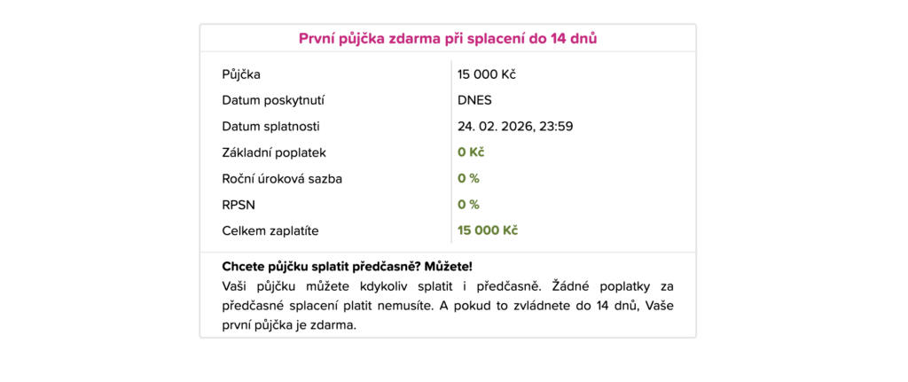 - První půjčka zdarma: Ano, do 15 000 Kč při splacení do 14 dní
