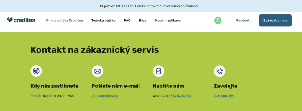 Pro komunikaci s poskytovatelem je k dispozici několik kanálů. Creditea kontakt zahrnuje telefonní linku, e-mail i moderní komunikaci přes WhatsApp.