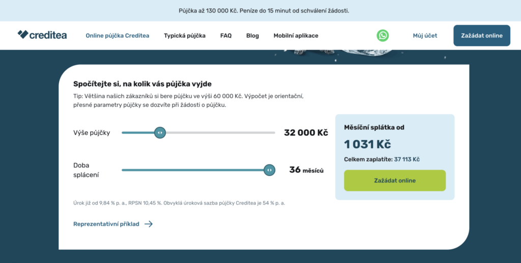 | Creditea | 130 000 Kč | 10,45 % | 6–36 měsíců | Zdarma |