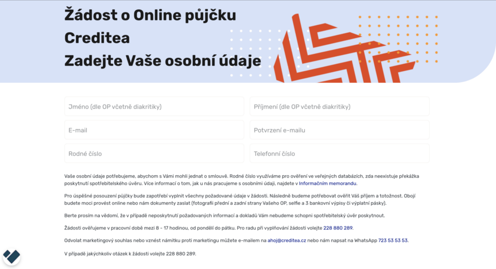 Creditea kontakt je dostupný na telefonní lince 228 880 289 a e-mailu ahoj@creditea.cz.