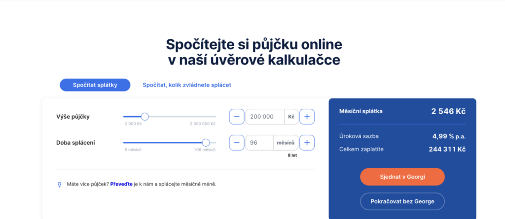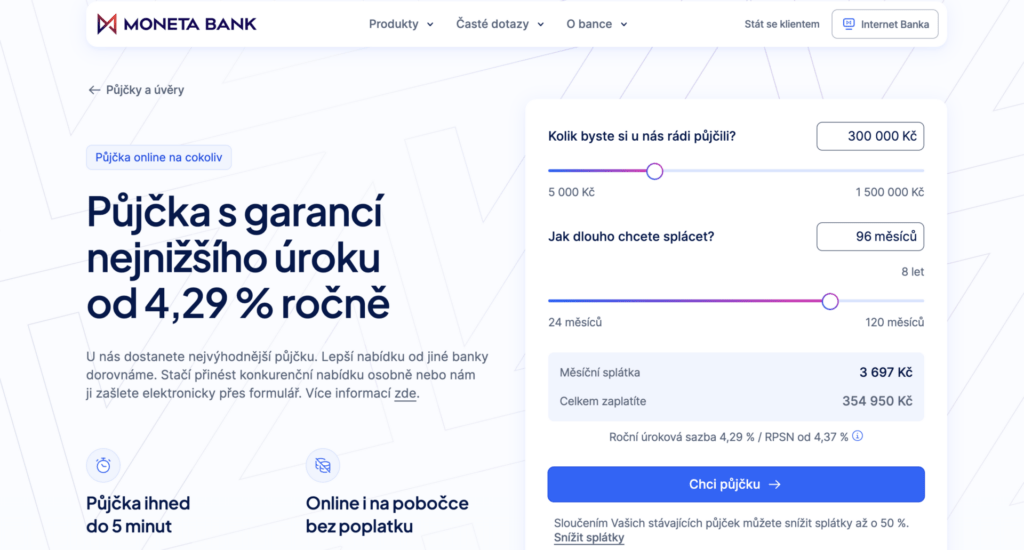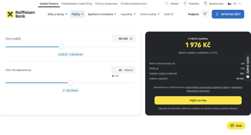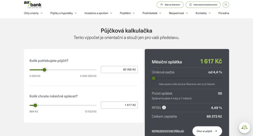 Online kalkulačky umožňují orientační výpočet měsíčních splátek ještě před podáním žádosti. Konkrétní podmínky se však vždy odvíjejí od individuálního posouzení bonity.