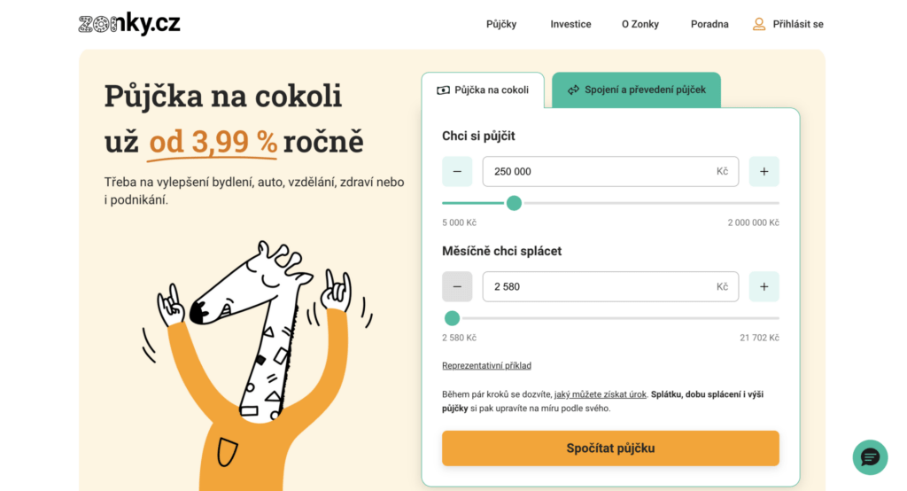 Kalkulačky nabízejí Air Bank, Zonky, Raiffeisenbank i nebankovní poskytovatelé. Výsledky jsou orientační a finální nabídka se může lišit.